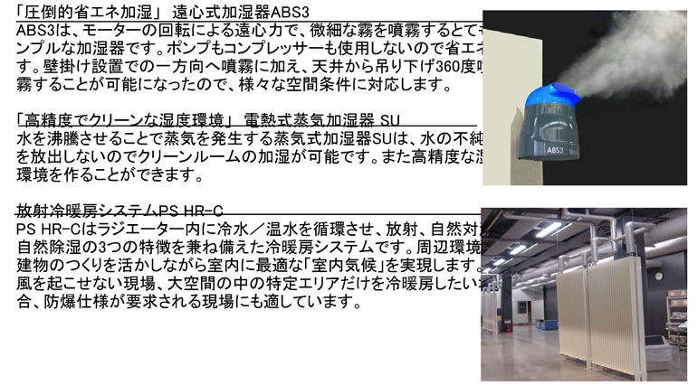 生産性や品質を維持するために温湿度管理は非常に重要である。ピーエスは、日本初の加湿器メーカーとして1960年創業、温度と湿度の専門企業として、様々な産業分野に地域の気候を活かした最適な「室内気候」を提案してきた。