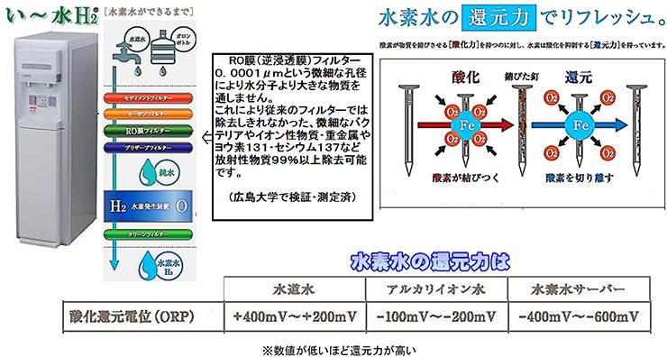 •いま巷で注目されている水素水には活性酸素の増殖を還元力で防ぎ若々しい細胞を維持します。
