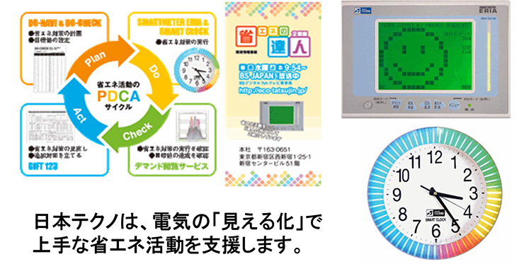| 企業紹介 | 日本テクノは、発電・電力小売から電気設備の保安管理『SMARTMETER ERIA』と『SMART CLOCK』による「電気の見える化・理解(わか)る化」で電力コンサルティング、設備改善や電気工事まで、電力に関して一貫したサービスを展開しています。 | ||