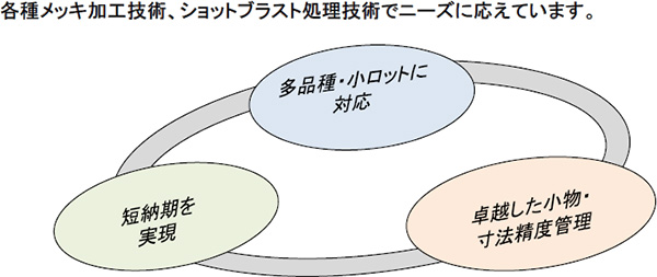 | 提供できる価値及び応用分野 | 各種クロームメッキ関係を得意としています。 少量多品種・短納期で各種電気メッキ及びショットブラスト処理に対応できます。 主要製品以外に下記の各種電気メッキが対応可能です。 1.光沢銅・ニッケル・クロームメッキ 2.サチライトニッケル・クロームメッキ(耐食性良好のつや無し仕上げ) 3.無光沢ニッケル・クロームメッキ(つや無し仕上げ) 4.黒色クロームメッキ 5.黒色ニッケルメッキ |