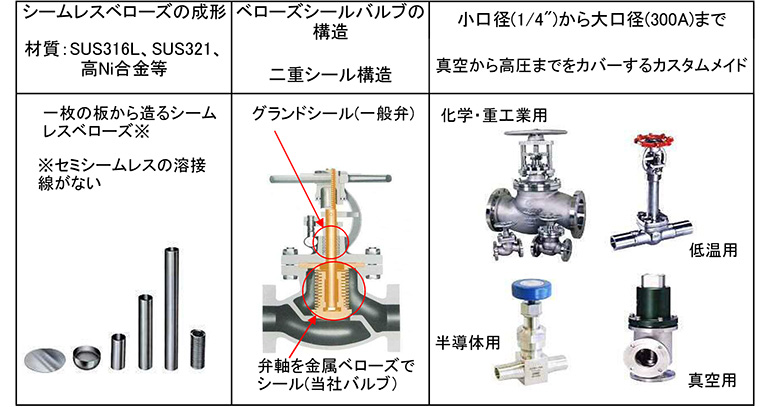 ●当社ベローズの技術的強み:国産初の金属シームレスベローズを開発し、長年蓄積した固有技術を基に、バルブ専用のベローズを設計し、組み込んだ信頼性の高い、ベローズシールバルブです。