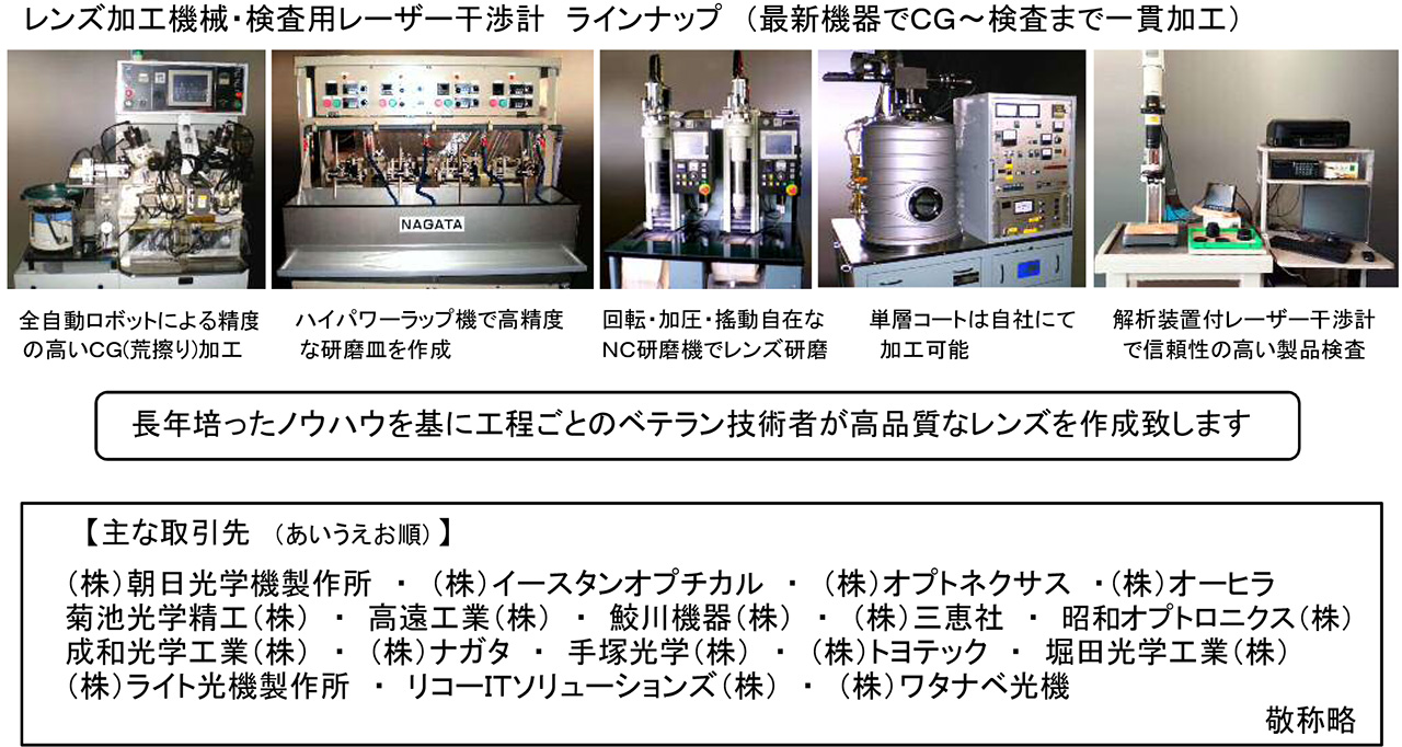 | 提供できる価値及び応用分野 | 平成24年度及び平成25年度ものづくり補助金獲得により高性能研磨皿ラップ機及びNC研磨機を増設 より高品質なレンズ研磨が可能となった事に加え、解析装置付きレーザー干渉計も設備し信頼性の高い レンズの提供が可能となりました ※ 当社の主要設備等は上記URLにてHPからもご確認いただけます |