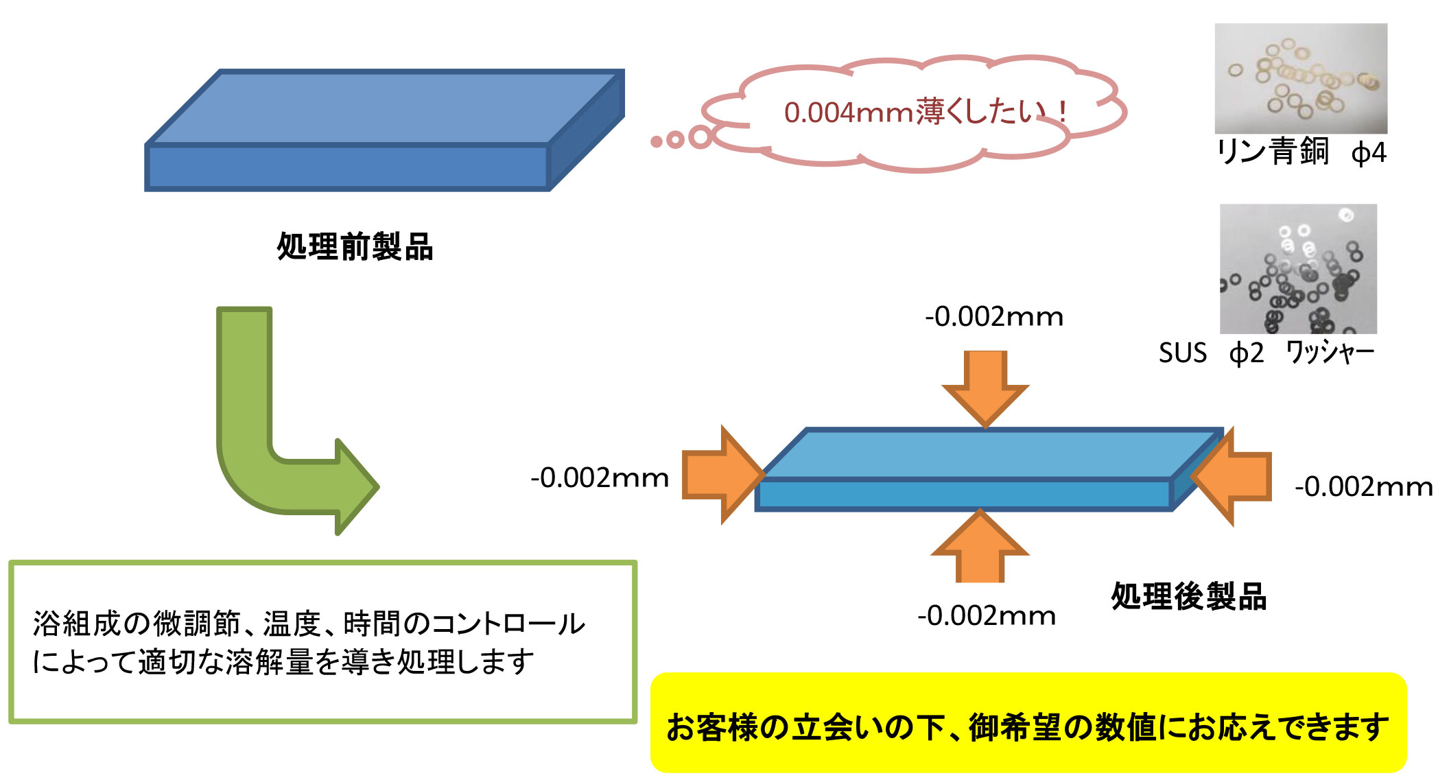 <寸法調整>*バフ研磨などでは不可能な微細かつ複雑な形状のものを一定量溶解。浴組成の微調節、温度、