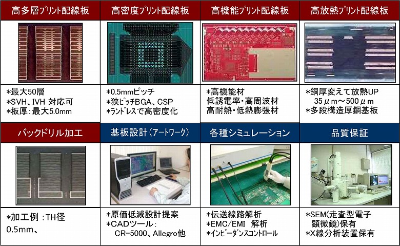 当社は、明治43年工業彫刻を生業に創業し、今日ではプリント配線板のメーカーとして培われた技術・品質で高信頼性の製品を提供しています。両面板から多層配線板に至るまで少量多品種から中量産を一貫して供給できる基板メーカーです。最近では、バックドリル対応可能なNCマシン、微小シルク捺印を可能とするインクジェット機等の設備導入や、製造ラインでは生産革新活動を通し、様々な工夫・改善を行い、基板製造コスト抑制・LT短縮に努めています。