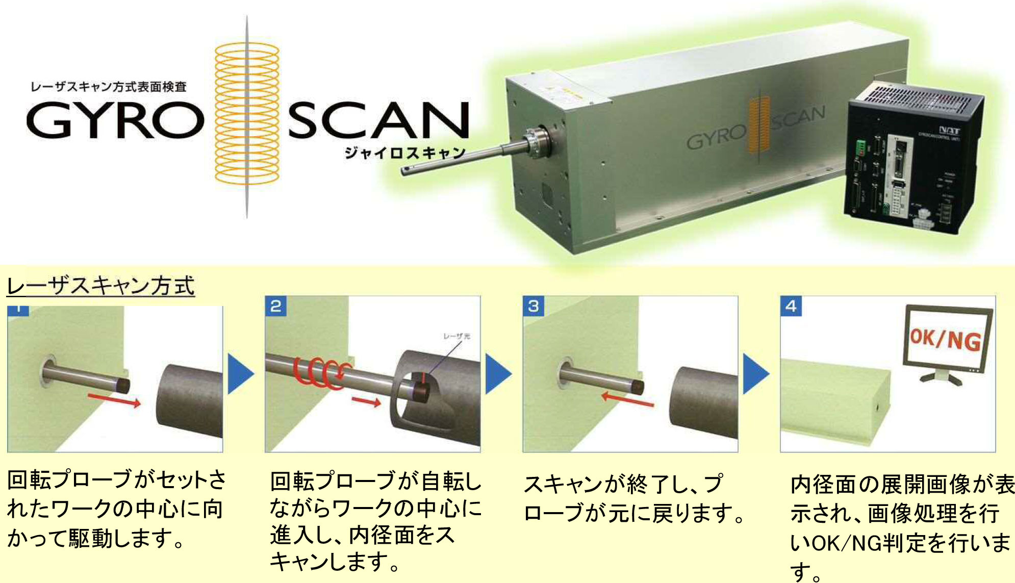 | 特許取得・各種認証等取得状況 | ※当社製品ジャイロスキャンに関して ①・CEマーク取得済み ・米国FDA認証取得済み ②・高精度なのに高速スキャンが可能。最少検出サイズφ0.05mmの精密な検査が生産品質向上に貢献します。 ・自動車、輸送機器/電機、精密機器/工作機械、産業機械等の納入実績有り。 |