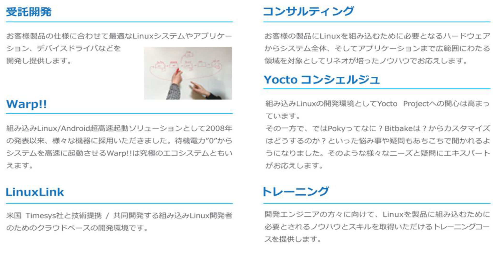 開発環境や製品の価値を高めるソフトウェアからプロフェッショナルサービスまで、機器へのLinux搭載に必要なトータルソリューションを提供しています。小さな機器にもOSが搭載されネットワークに接続し様々なコミュニケーションが行われる、これらの機器が「よりよいもの」「より使いやすいもの」「より速いもの」になることを願い、リネオは製品開発を進めます。1984年の創業より今日まで、長野県塩尻を拠点に組み込みソフトウェア開発のエキスパートとして多くのお客様から高く評価いただいています。