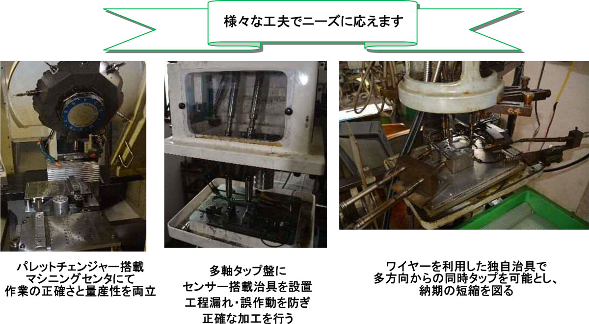 | 提供できる価値及び応用分野 | 主要設備 ・マシニングセンター 2台 ・多軸タップ盤 18台 ・単軸タップ盤 15台 ・フライス盤 1台 ・ボール盤 2台 |