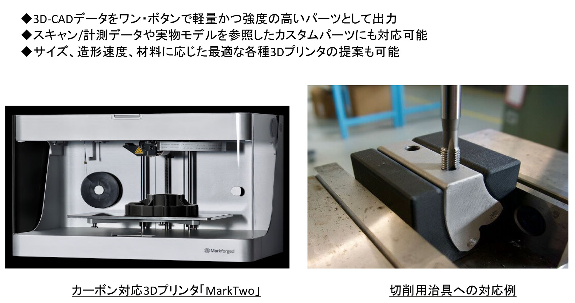近年の3Dプリンタ技術は目覚ましい進歩を遂げ、試作やデザイン業務から生産技術部や製造現場で活用するシーンが増えてきました。弊社が取り扱うMarkforged社製3Dプリンタ「MarkTwo」は世界で初めてカーボンファイバーに対応し、アセンブリ/切削/検査用の治具や耐熱や強度を必要とする機能部品の造形に適した3Dプリンタです。弊社ブースでは3Dスキャナやリバースモデラまで含めた3Dデジタル・プロセスの構築をご提案します。