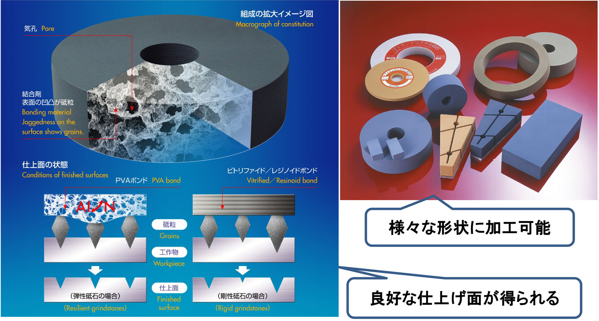 ・弾性のある砥石であるため、砥粒の刃先が揃い、良好な仕上げ面が得られます。