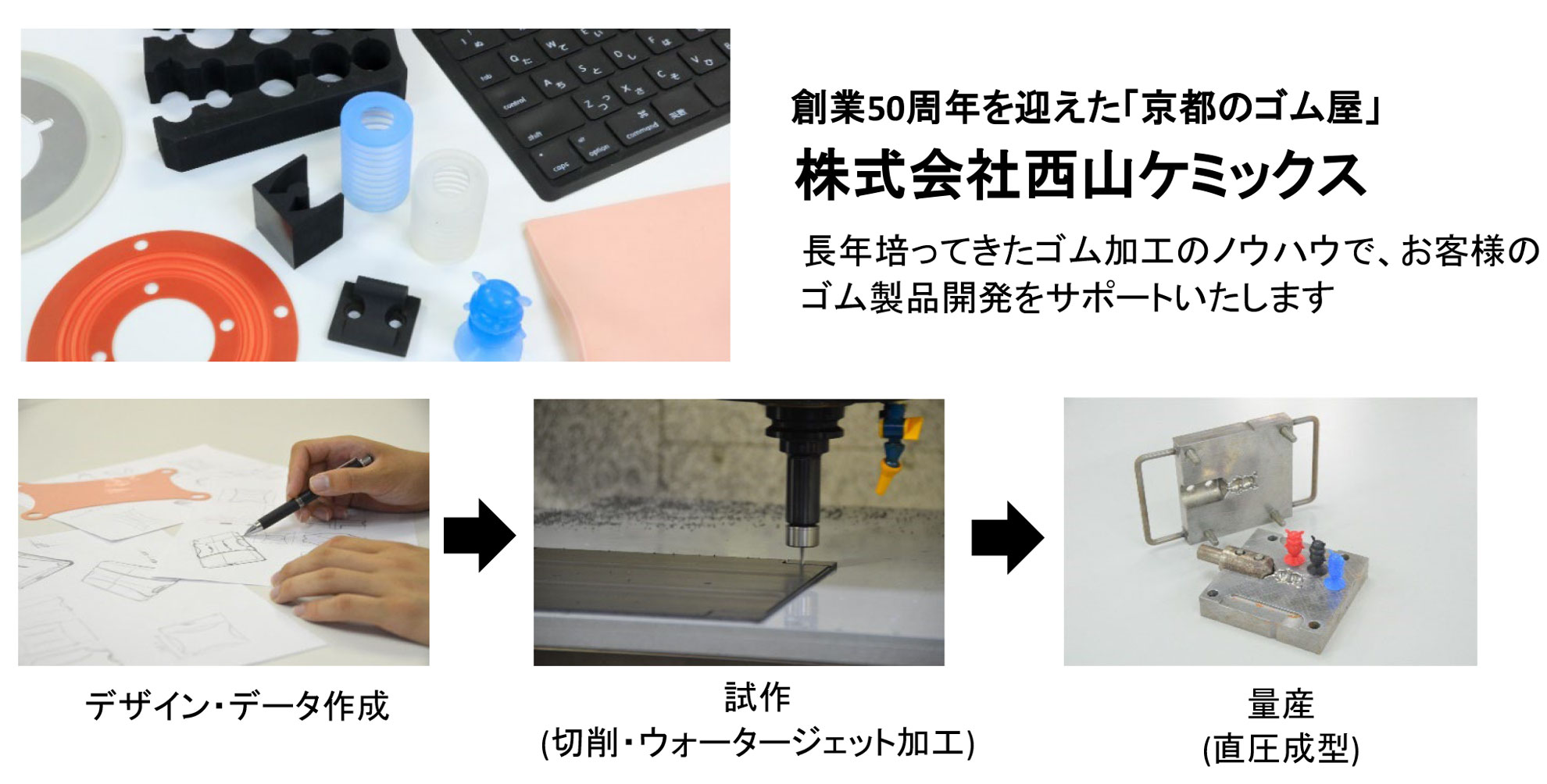 | 企業紹介 | 株式会社西山ケミックスは、モノづくりの盛んな京都の宇治市でゴム加工と液晶保護フィルム加工を中心に行っている会社です。 | ||