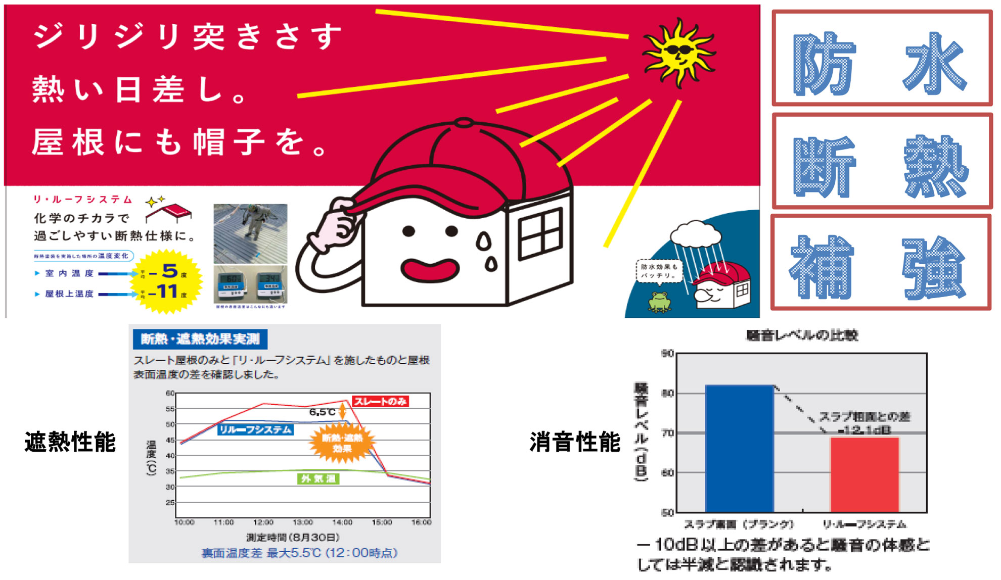 ①防水 ②遮熱 ③断熱 ④補強(スレート) ⑤消音 を実現します