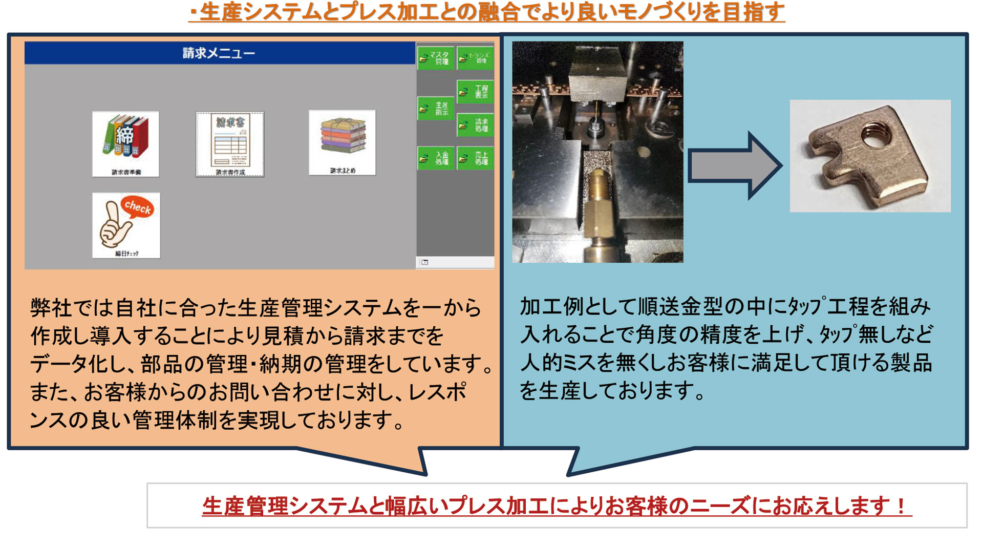 | 企業紹介 | 長野県で金属プレス加工のことならヤマダプレスへ 創業62年の経験と実績による膨大なノウハウと高い技術力。 私たちは自らの製品によって人を支え、街を支え、素晴らしい未来への寄与を目標としています。 |