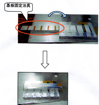 | 治具に基盤を固定する際テープで止めていた | 新たに基盤固定治工具を作成し、 ワンタッチ化した |