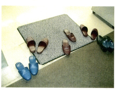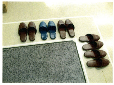 | スリッパがバラバラに脱ぎ捨ててある | テープでスリッパの置く場所を決めた |